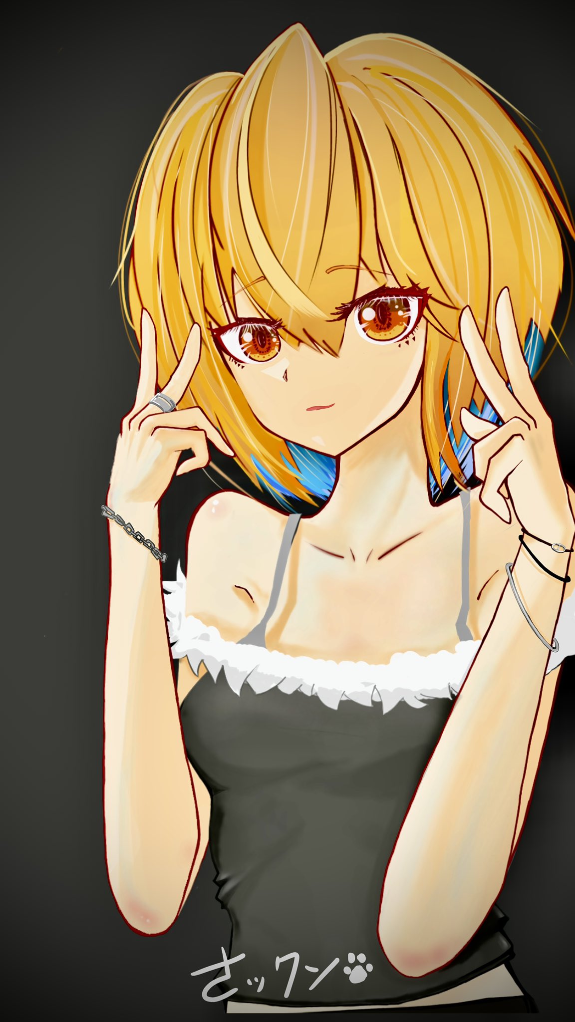 ダブル裏ピースをしてるクレムのイラスト。 かわいい…!表情がとてもいいですね… ちょっとお姉さんというかギャルっぽさがありますね。好きです 髪の毛束の表現がお上手で素敵です。ちょうどよい描き込み感ですね。 アクセなんかつけちゃってまぁ… あとサインが可愛い。私もサイン作ろうかな 素敵なファンアートありがとうございます! ※2025/8/17追記 目を修正したものをいただきました(下のイラスト)!優しげになったこちらも素敵ですね!