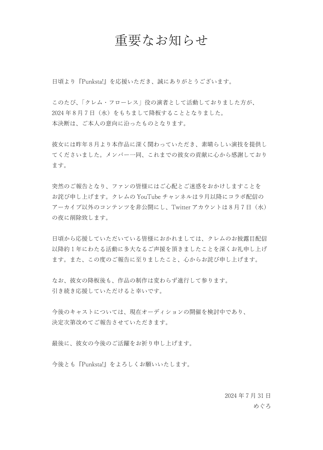 昨年からクレム・フローレス役を務めてくださった演者様が降板することとなりました。 これまでの彼女の貢献にはメンバー一同感謝しております。本当に今までありがとうございました。 詳細はまだ決まっておりませんが、近々クレム役の募集を開始します。 引き続きPunksta!をよろしくお願いいたします。