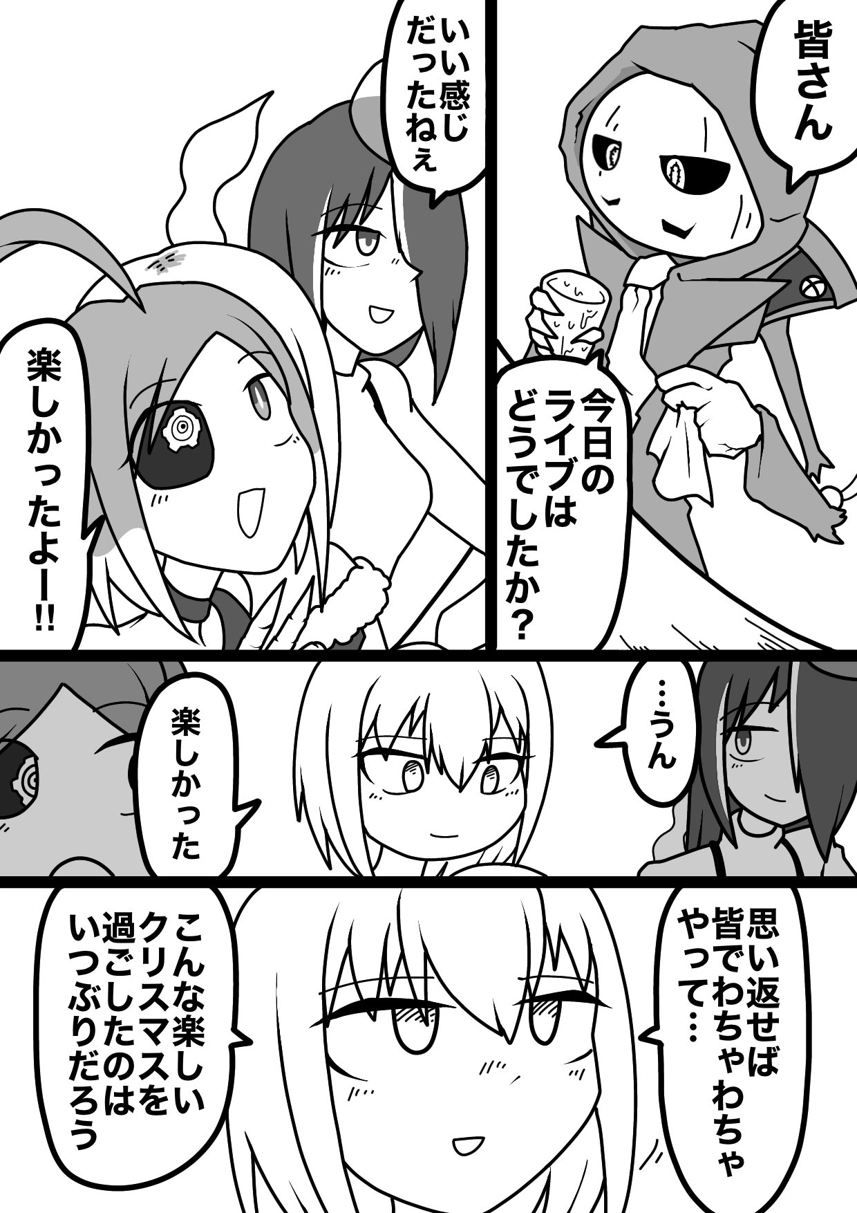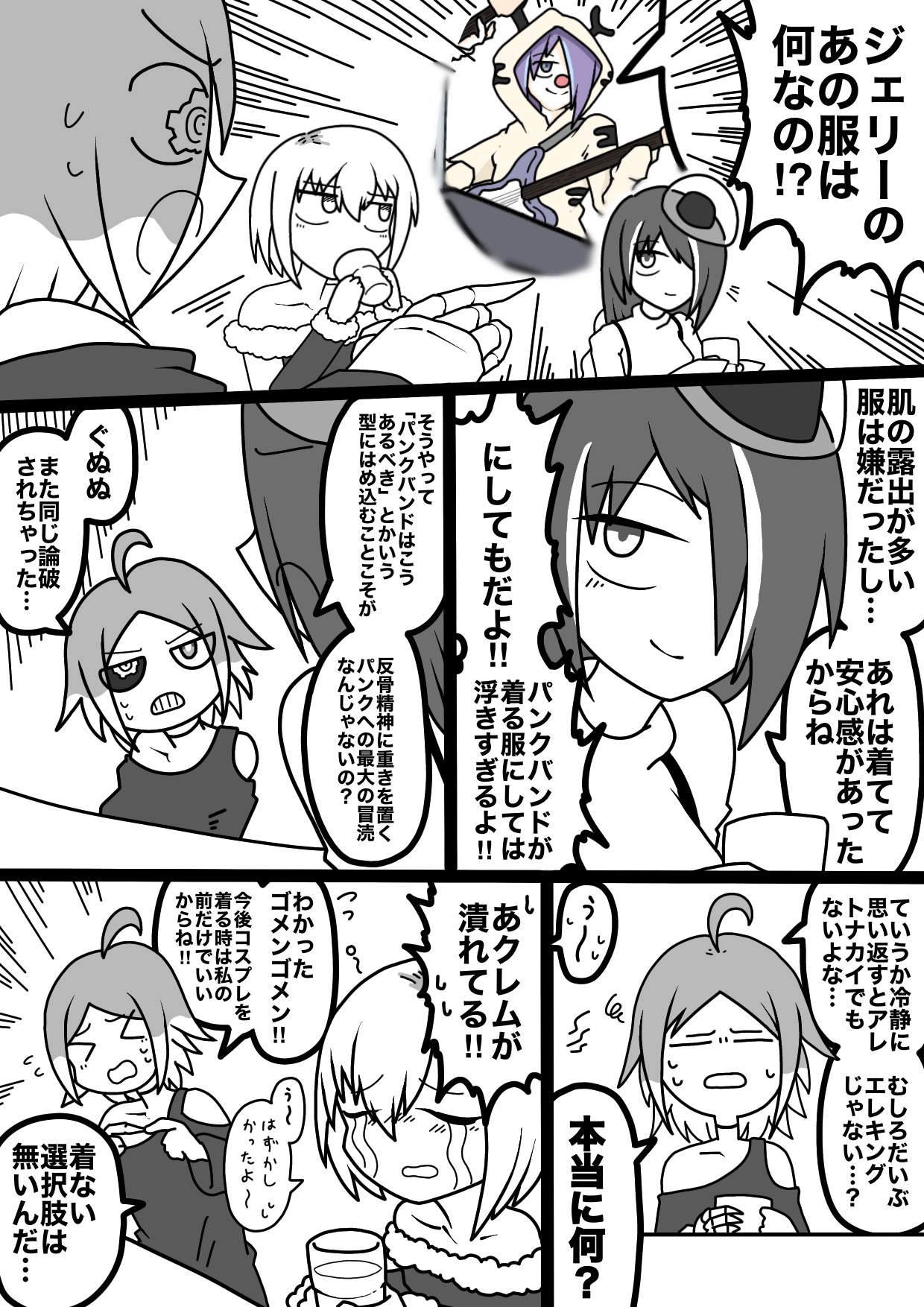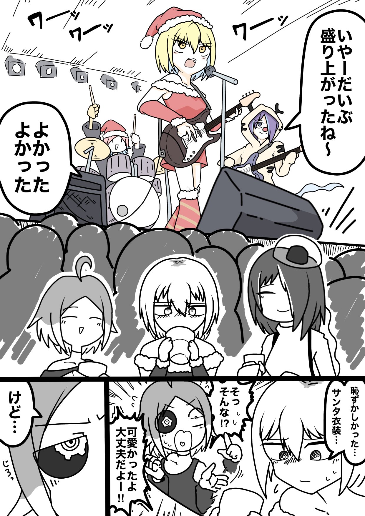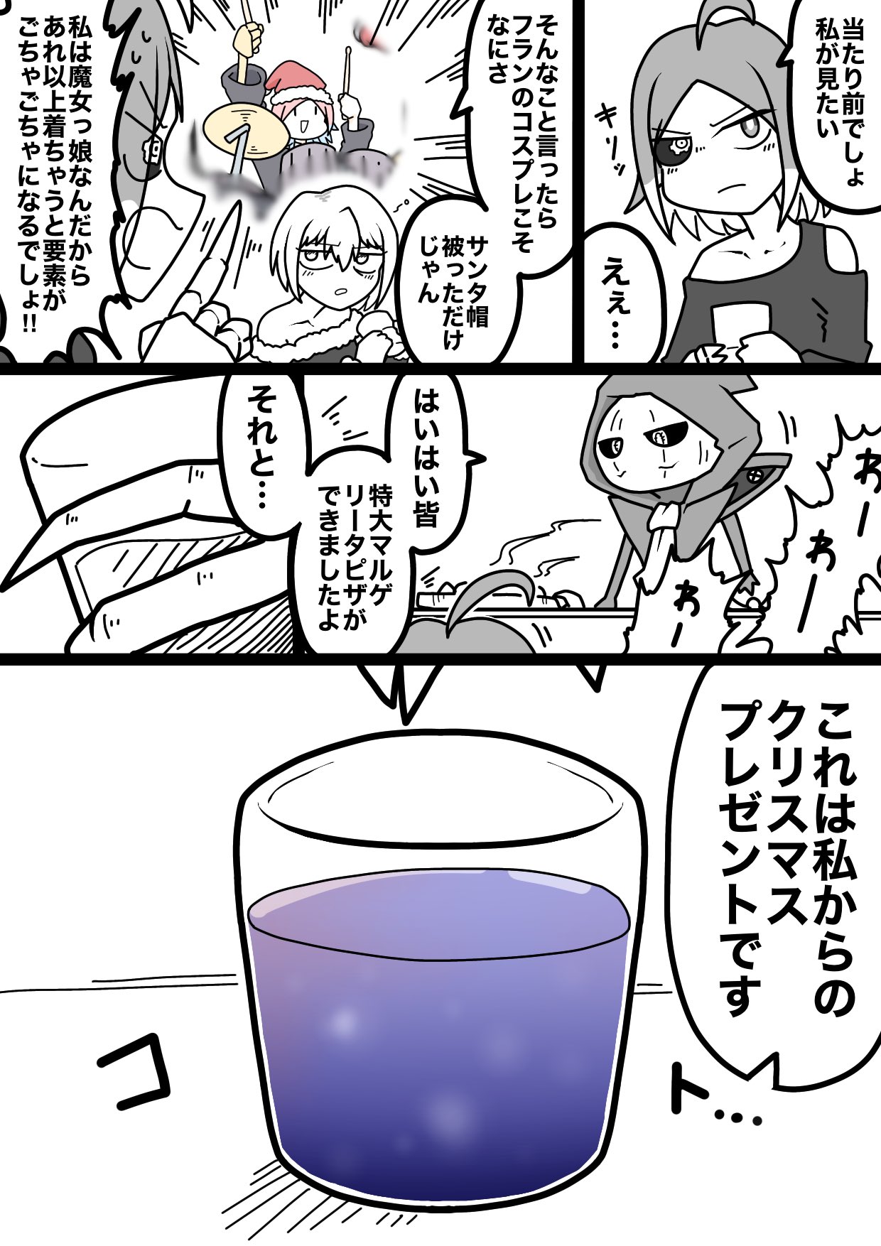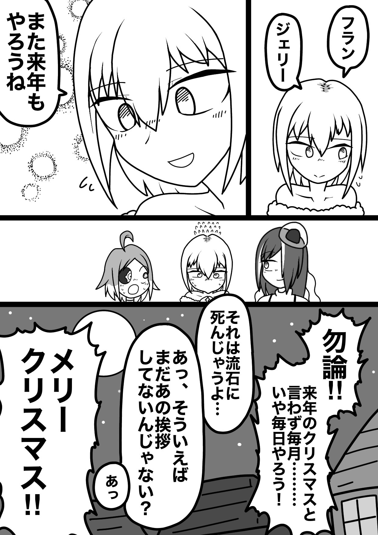 Punksta!のクリスマス漫画(!!!)。 感無量です。どれくらい時間かかったんだろう…。本当にありがとうございます! 内容も仲良さそうでとてもいいですね。かわいい。 アニメコントの内容もよく反映されていてよく見てくださっていることがわかります。 「マスタ~私の分は~?」って言っているジェリーが好きです。 素敵なファンアートありがとうございます!